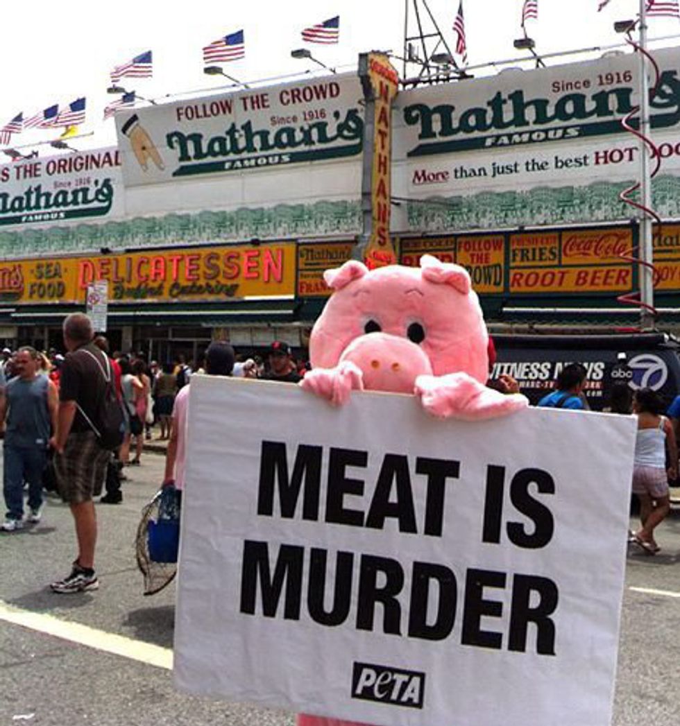 While many people were at cookouts, and Fourth of July parties, a vicious assault took place at the Nathan's Hot Dog Eating Contest. If you haven't seen the footage yet, I'll link it below. Essentially, a couple PETA/animal rights members bum rushed the stage and sprayed numerous contestants with fake blood. Security quickly went to work expelling the trespassers off of the stage, and the contest continued without a hitch. However, for a few short moments the contestants were rattled and thrown off. Let me get something off my chest, I'm not anti-PETA, I would categorize myself as someone against animal cruelty. But that being said I have to disagree with PETA on this one and here's why...