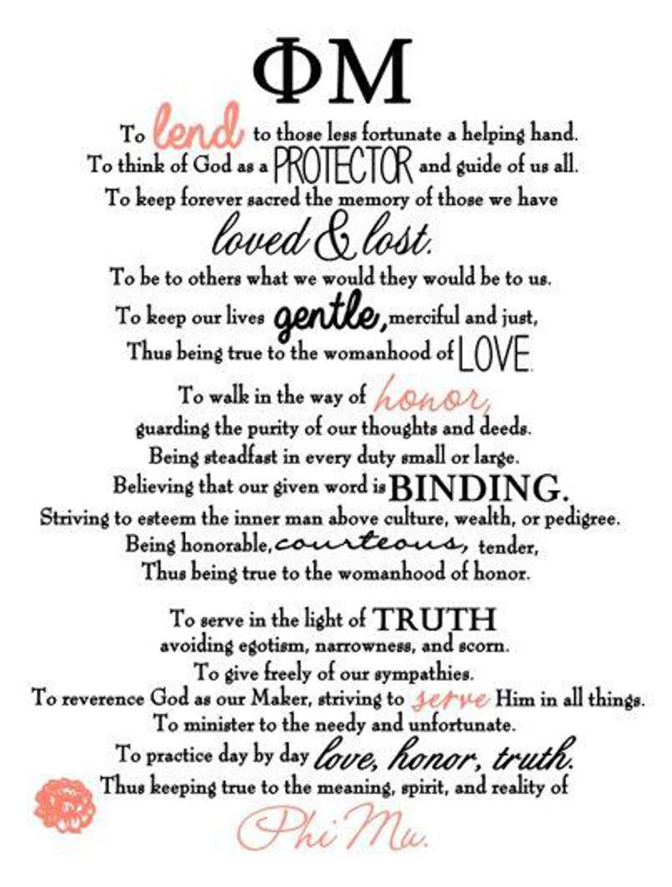 All Phi Mu members live their life by the creed, which outlines the ideals of our fraternity: Love, honor, and truth.