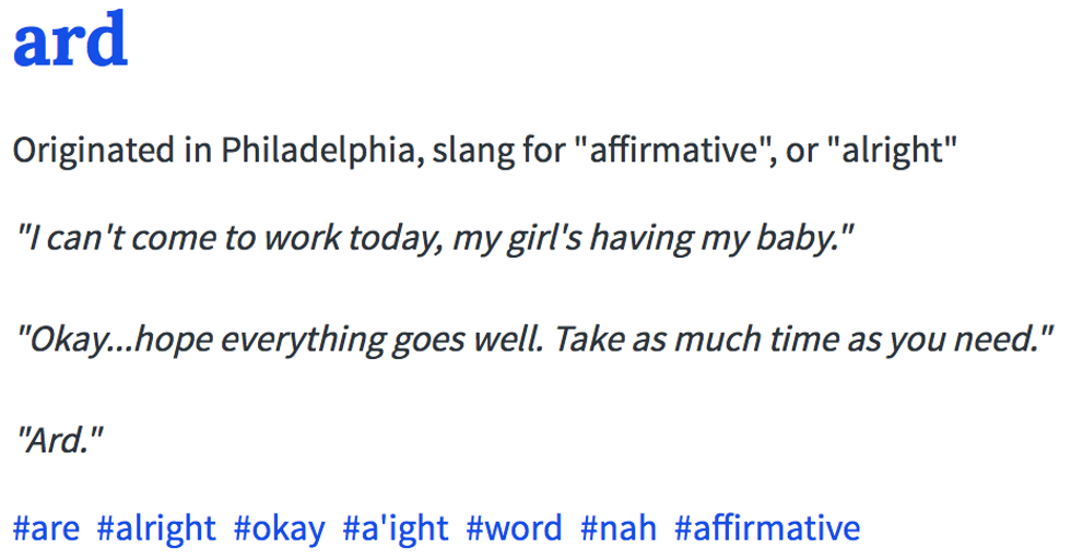 Ard: affirmative: agreement: almost like a word for nodding your head: usually paired with cool. Turns out, nobody in this entire country knows what "Ard" stands for except Philadelphians.