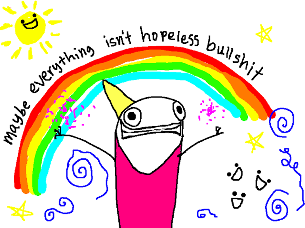 Depressing imagery aside, repression isn’t all about stuffing down a sadness one lacks the tools to process. There’s also anger, hate, lust, love, fear, guilt, shame, and even happiness sometimes. We’re good at repressing; we can repress anything. Just let the pressure explode a couple of times a year in a big eruption of emotion, public or private (the latter for me,) or vent it in small increments, little explosions carefully timed so as not to disrupt regular broadcasting (such as watching Grey’s Anatomy in order to cry heavily for 30 seconds which may or may not stretch into 30 minutes and you forget what made you start crying in the first place but you’re glad you are because it’s the only time during your day/week that you haven’t felt that one wrong breath will leave scattered pieces of you splashed across the campus because everything hurts but you don’t know how to feel things properly anymore…deep breath...for example).