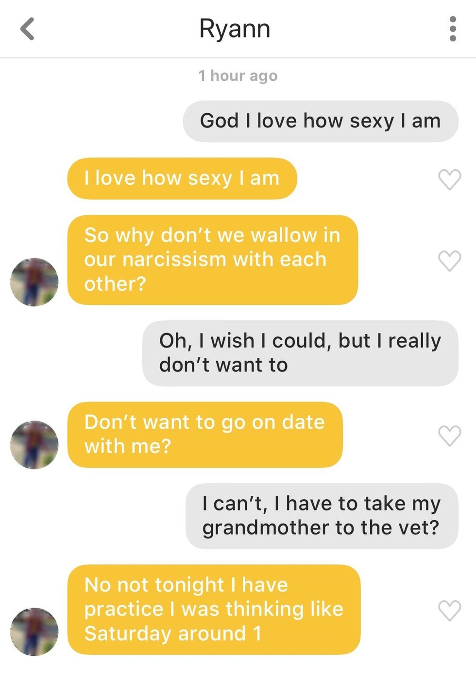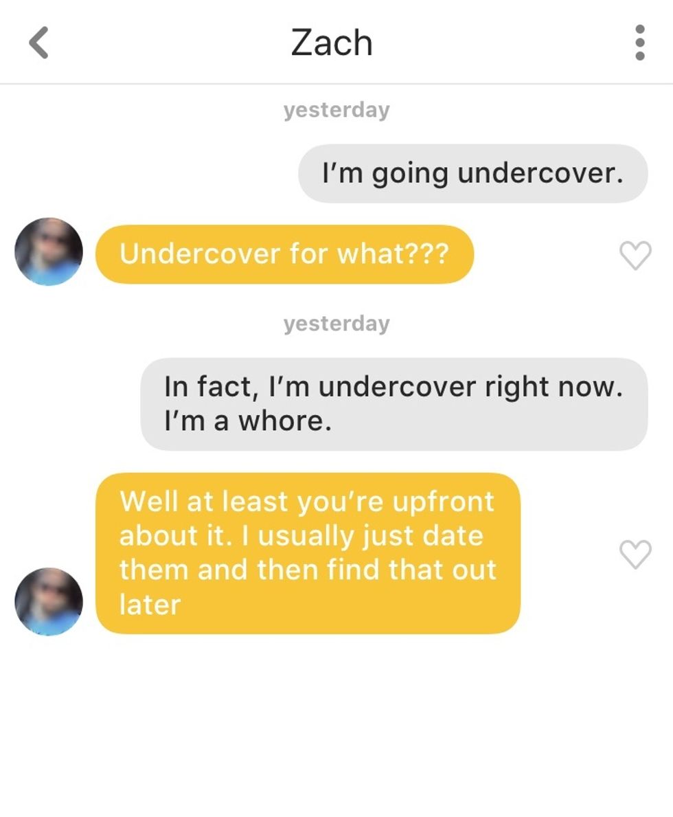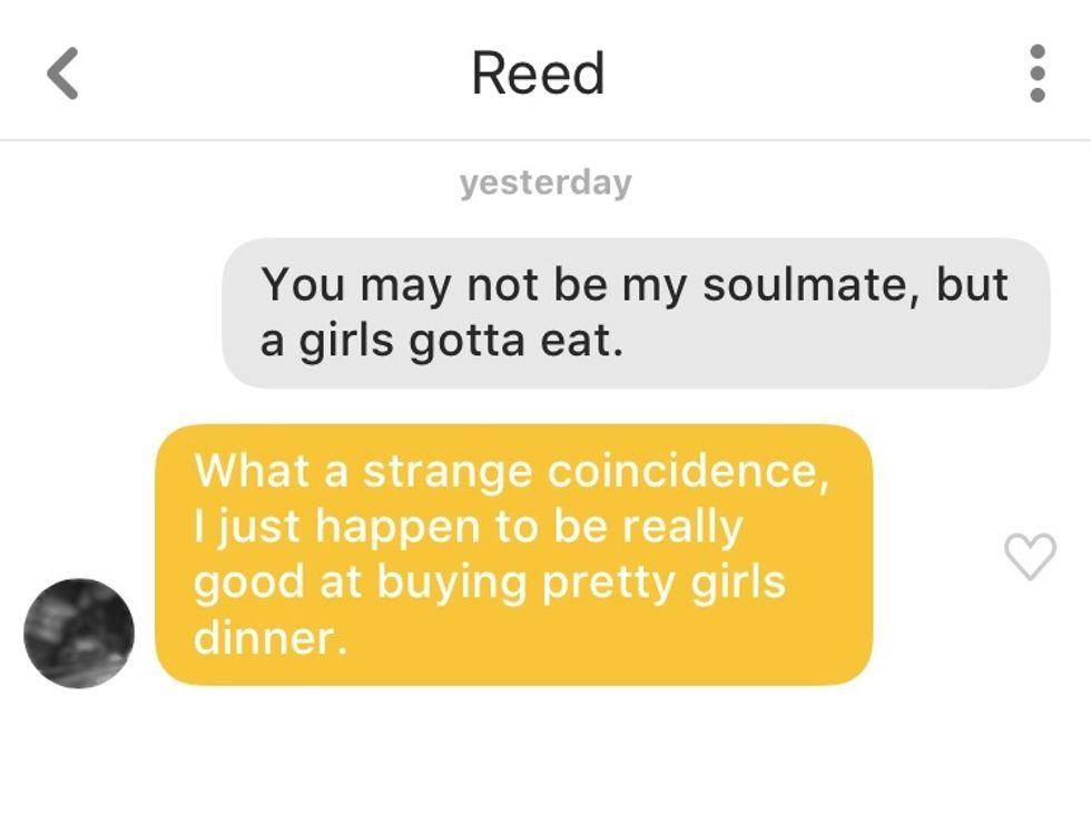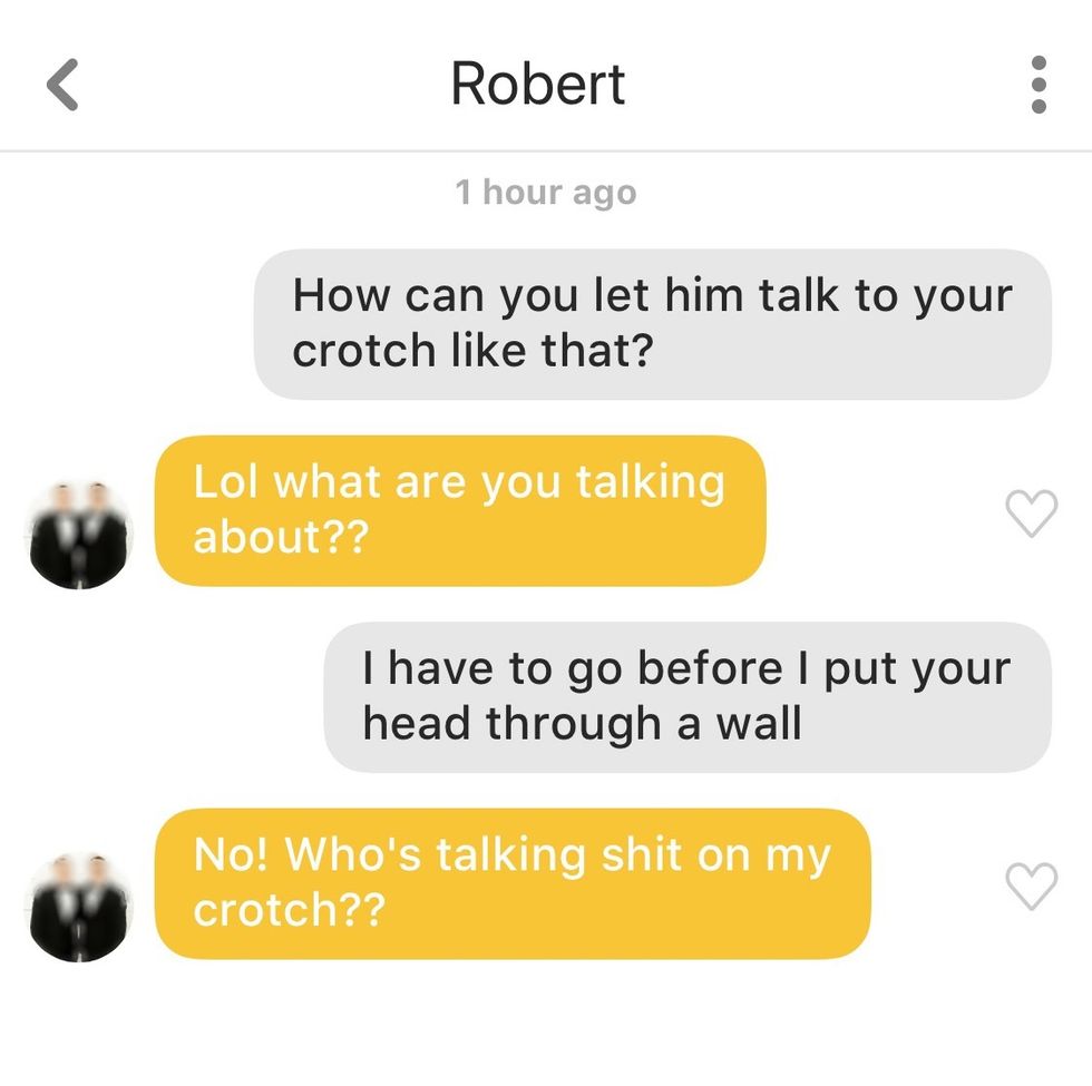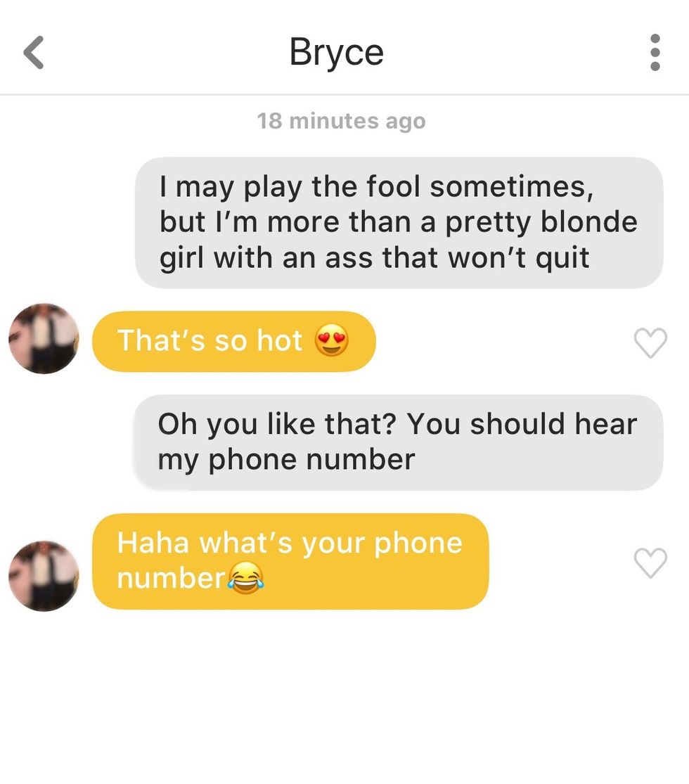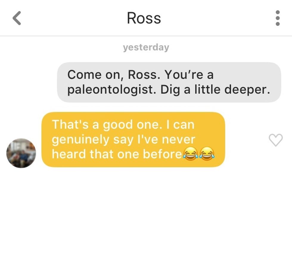 Phoebe Buffay didn't disappoint. Not only does she have mad game (probably cause she says weirdly sexual things), but every single guy responded no matter how off-the-wall the quote was. This just goes to show that you can send almost anything and guys will still try to have a good conversation. This experiment was entertaining, to say the least, but most importantly it gave me the confidence to step outside of the box and strike up a conversation with something more original than just "hi."