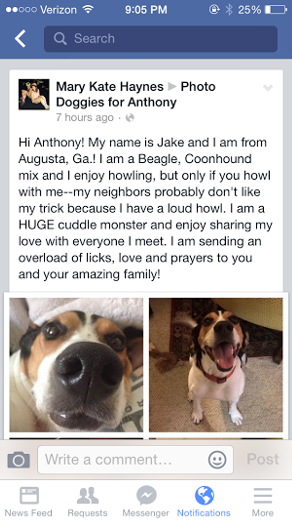 “Hi all, my friend Kristen Lyons has her son Anthony at Phoenix Children’s hospital. Some days he gets doggy visits and some he does not. They make him smile. I thought if I create this event, you can post a picture of your dog to help make him smile. His mom shows them to him and he smiles. REMEMBER: THIS IS NOT AN ACTUAL EVENT, ONLY TO POST YOUR PHOTO OF YOUR DOG FOR ANTHONY....AND....PLEASE, PLEASE NOTE WHERE YOU ARE FROM. This event has gone viral and Anthony and his mom Kristen are smiling happily. Me too.”