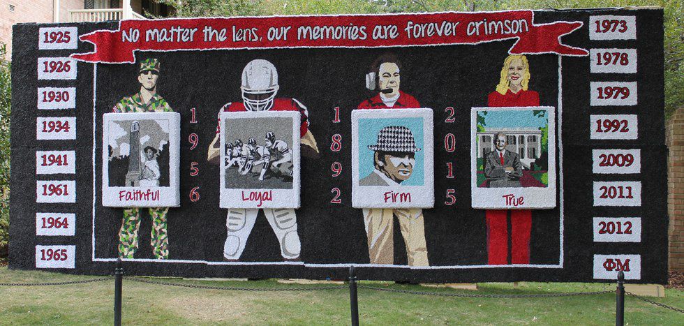 This year's theme was Forever Crimson: Firm, Loyal, Faithful and True. When all of the lawn decorations are completed, the homecoming committee judges them and picks a winner.