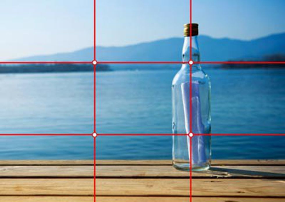 The Rule of Thirds is an idea that most professional photographers follow that pertains to how you arrange the subject of your photograph. What this rule basically tells you to do is to make sure that the subject is falling on one of the points where the grids meet. In the case of a portrait, you would want to make sure that the eye (or nose) is smack dab in the center of one of the third's grid intersection. In the case of this image, the bottle is placed where one of the thirds lines runs straight through the bottle. If this is all a little bit too confusing, your camera probably has an option where you can keep the grid on. Even iPhones have this capability. The reason for this rule is just to set a standard of aesthetically pleasing photographs, and it just helps the eye flow around the photograph easily. The goal is to always follow this rule... It is easier to successfully follow this rule, rather than successfully disobey this rule.