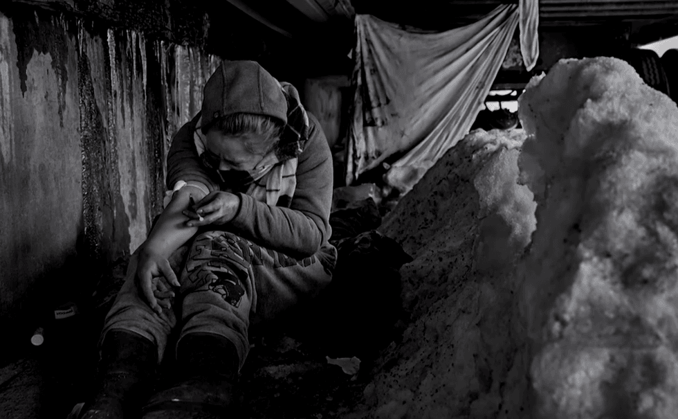 These men are squatting underneath a truck to avoid being seen using.