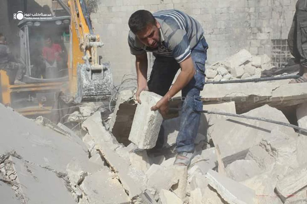 A barrel bomb landed on a house in the Jalloum quarter of Aleppo’s old city, destroying the house and killing seven members of one family — including all four children. Pictured below, is the father trying to dig up his children from the rubble.