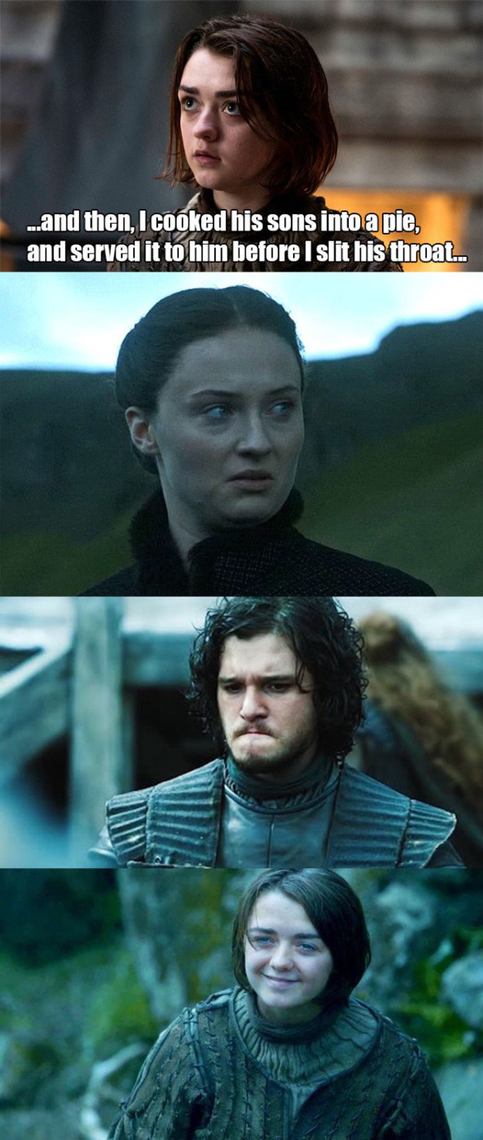 Arya needed some me-time to find herself, so naturally she went to an ancient house to learn how to peel people’s faces off so she could wear them. A little off the beaten path maybe but in the end she really did find herself so to each her own.