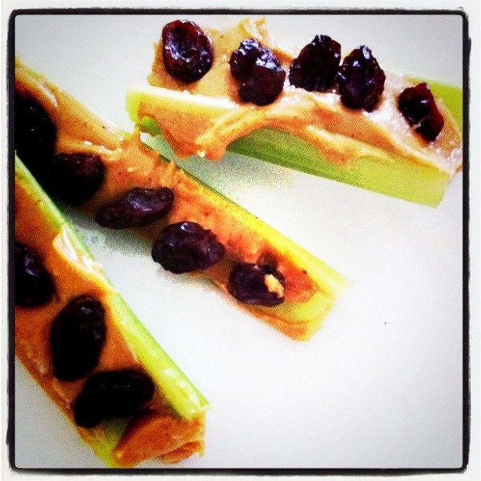 This one's simple. Fill the groove of each celery stick with creamy peanut butter and top them off with raisins. I remember eating these as a kid and loved them!