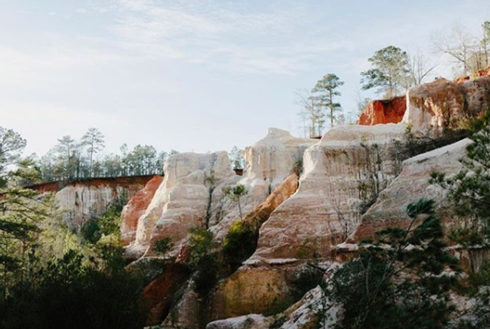 Providence Canyon is located in Stewart County, Georgia. The orange land is highlighted by the green trees and makes for an amazing backdrop for a picture.