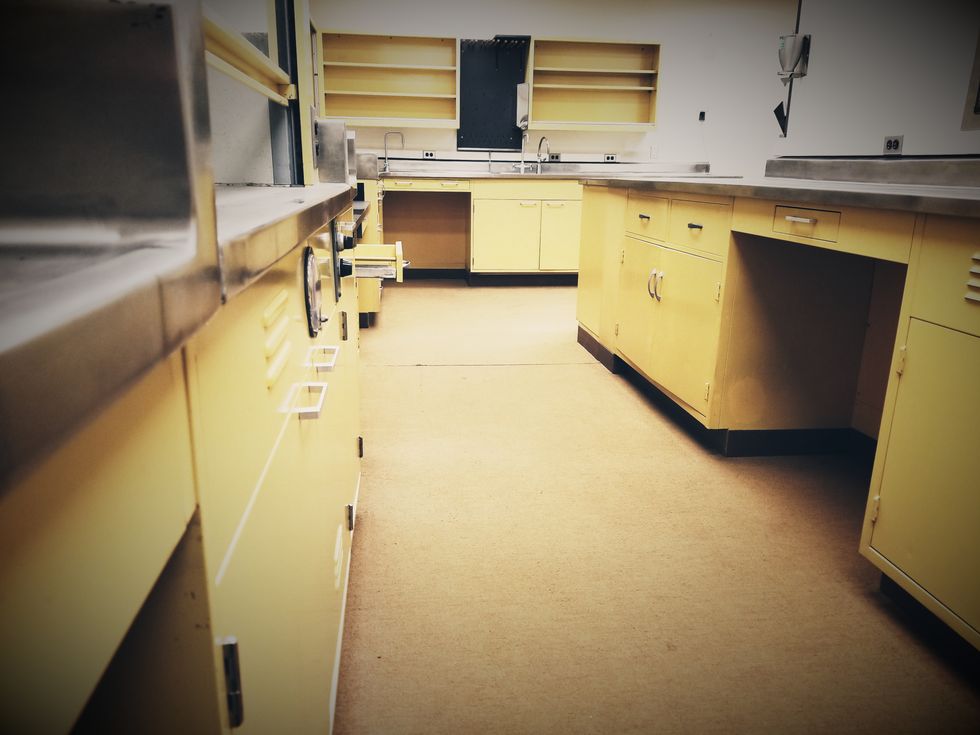This lab on the first floor hadn't been remodeled since the building was built. The canary yellow and stainless steel were in sharp contrast to the more modern labs upstairs.