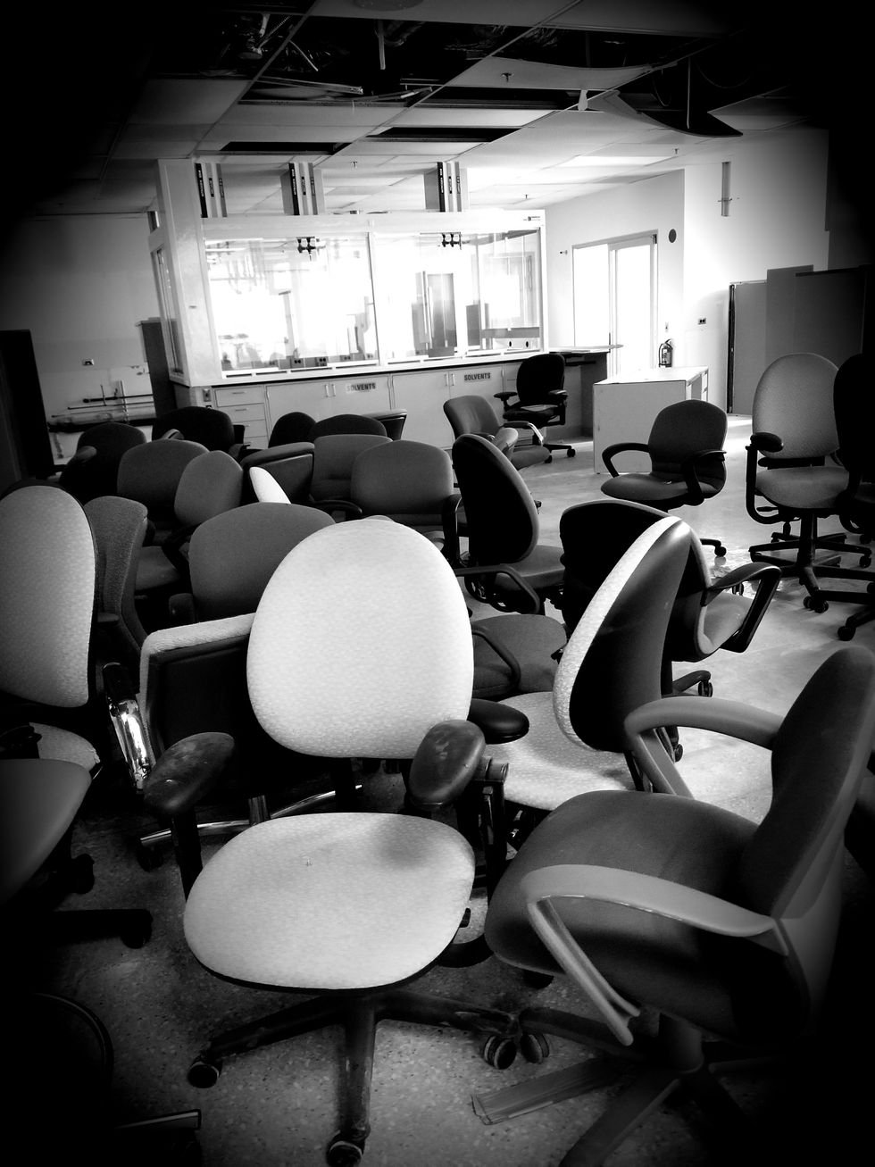 This one-time laboratory was now a catch-all for storage. Chairs and multiple types of office supplies littered the room. It was out of place with the rest of the surroundings. Many of the buildings were trapped in the late 90s or early 2000s. Most of these office chairs date from around 20 years ago.