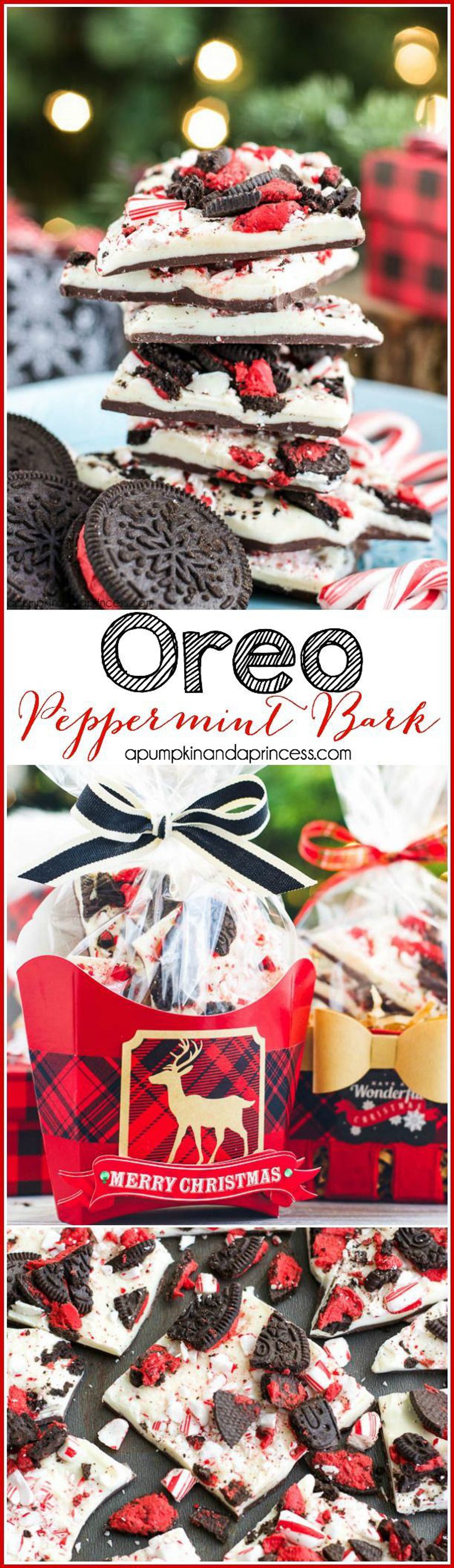 This dessert is fun and not too heavy after you've stuffed your face for the last three hours. And it only takes four ingredients! All you need is: 8 ounces of chocolate, 12 ounces of white chocolate, 8 Oreos, and 6 candy canes. Find it on apumpkinandaprincess.com.