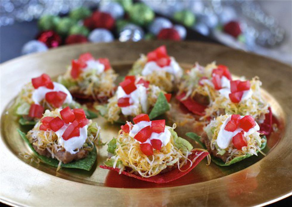 Our favorite meal made into a holiday treat. This might be your chance to convince your mom to make tacos to Christmas dinner. All you need is: 1 can of refried beans, some tomatoes, shredded lettuce, sour cream and green and red nacho chips. Found on Thehopelesshousewife.com