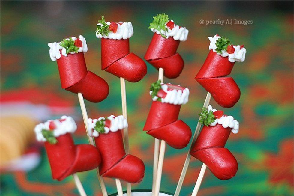 Why didn't we think of this? One hot dog makes two stockings. Just cut the hot dog in half two times, place together on a barbecue stick like shown above, and throw some cream cheese and parsley on top. Bam! Found on thepeachkitchen.com.