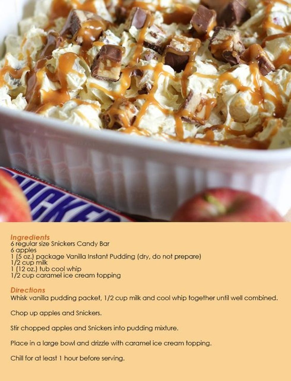 The sweetness of Snickers meets their match with the tanginess of apples in this magnificent dessert. It is so quick to make, because you just chop the Snickers and apples and dump everything else into a bowl, then stir.