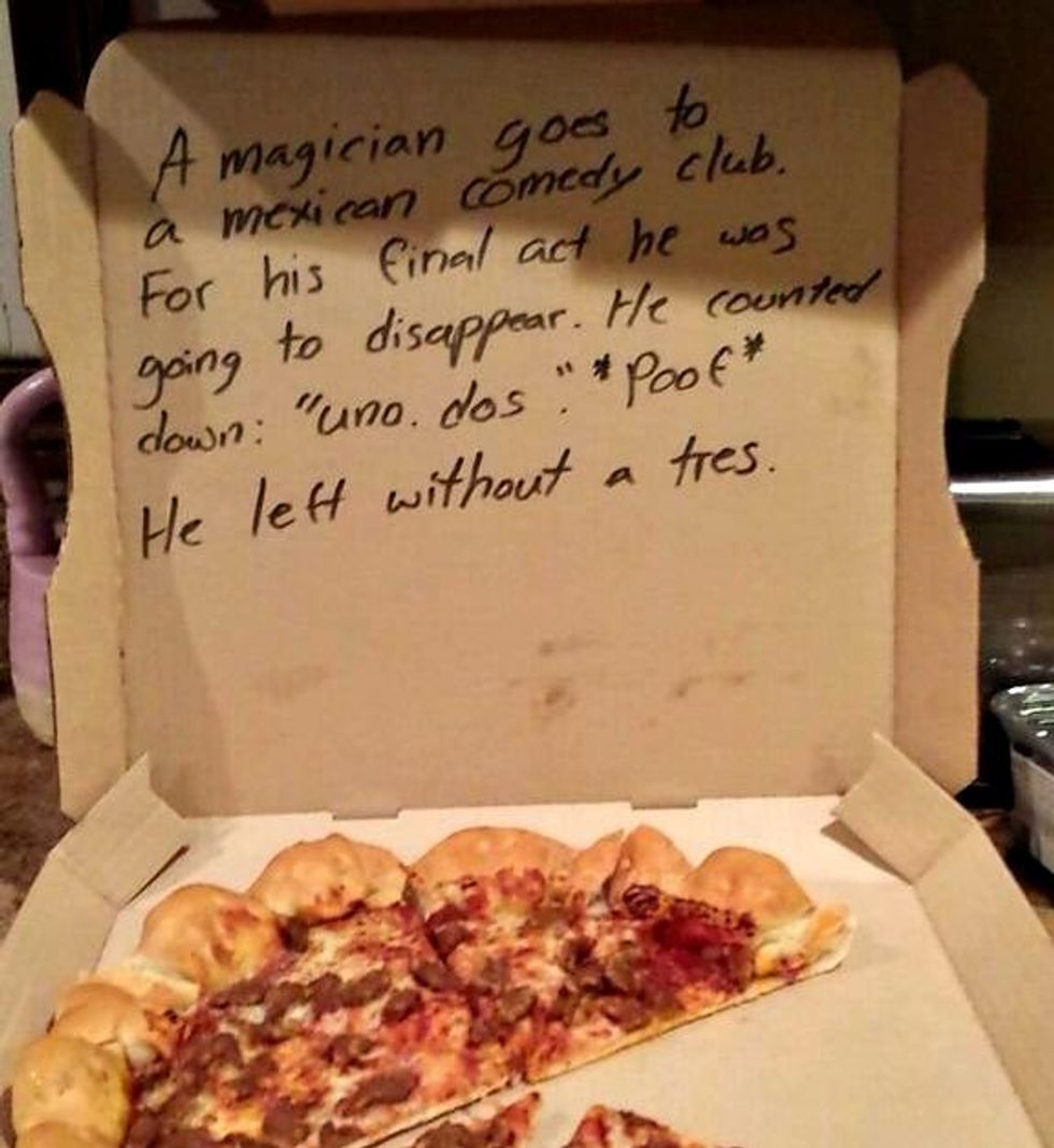 No matter what level of stress I'm on, pizza is always there to calm me down. With every slice that enters my stomach, I can feel bits and pieces of negativity leave my body. Not to mention, if you request it, delivery drivers will write a joke or draw a funky little picture on the inside of the box! If that isn't a great example of a community looking to boost each other up when feeling down, I don't know what is.