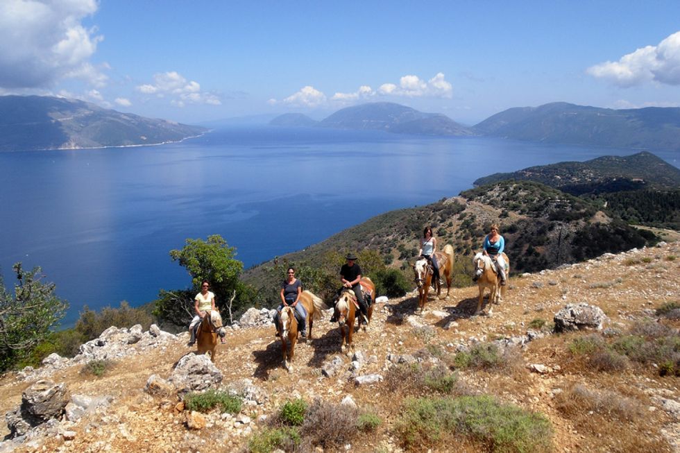 The vacation begins at a German-Greek Ranch, having the opportunity to ride mostly Italian Haflingers.The rider will be able to venture the mountains forested with black conifers, green hills, ancient ruins, herds of goats and donkeys. There is the scent of wild herbs, timeless monasteries, and sandy beaches. It is also the island that Captain Corelli play his mandolin. The accommodations include a small apartment complex and/or with the guides in their own house in the village.