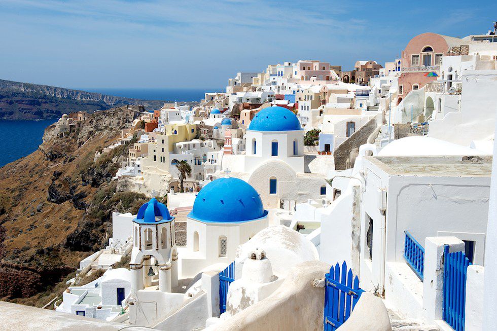 Hint: The lime or whitewashed cubed stone architecture similarity to Cyclades houses and the similarity of the blue domes to the Santorini churches.