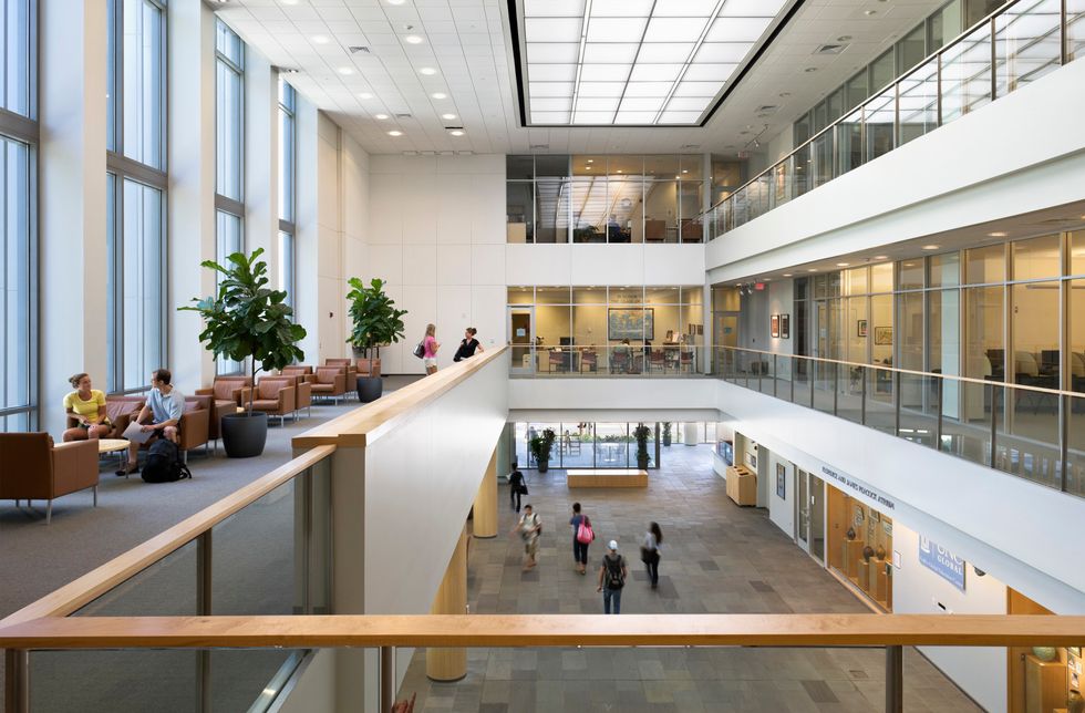 This is personally one of my favorite buildings on campus hands down; equipped with modern decor and architecture, a delicious coffee shop, open patio on the fourth floor, this building is relatively quiet and embodies a peaceful ambiance that you can take endless naps in. You can't spend an hour in here and not feel refreshed and productive afterwards. I highly suggest napping in here.