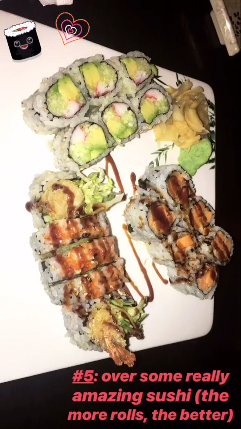 Treat yourself for a little date night...with yourself! Go to a local sushi place and order as many rolls as you desire, you can't write on an empty stomach!