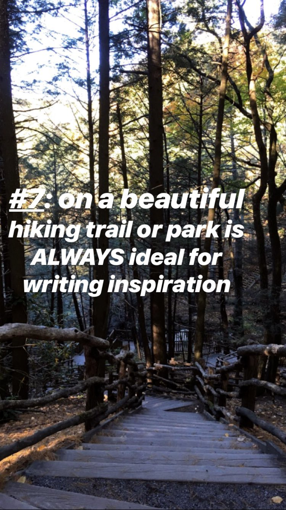 Go hiking with a backpack full of all of the essentials, including paper and pen! It's a calming and peaceful way to begin writing, and make sure to take some pictures too while you are at it!