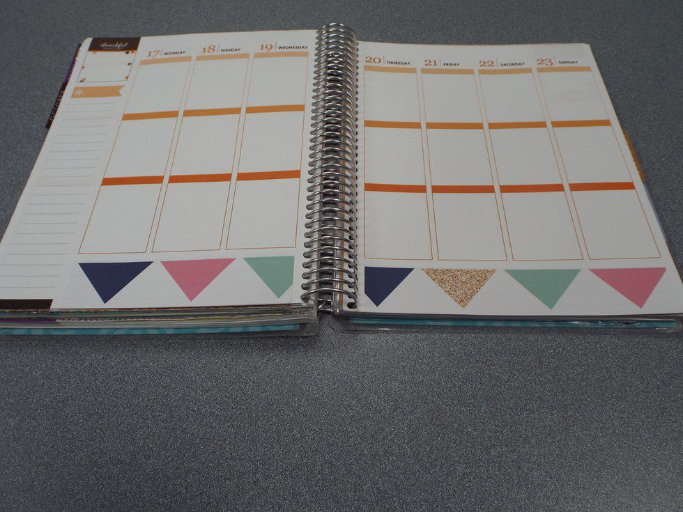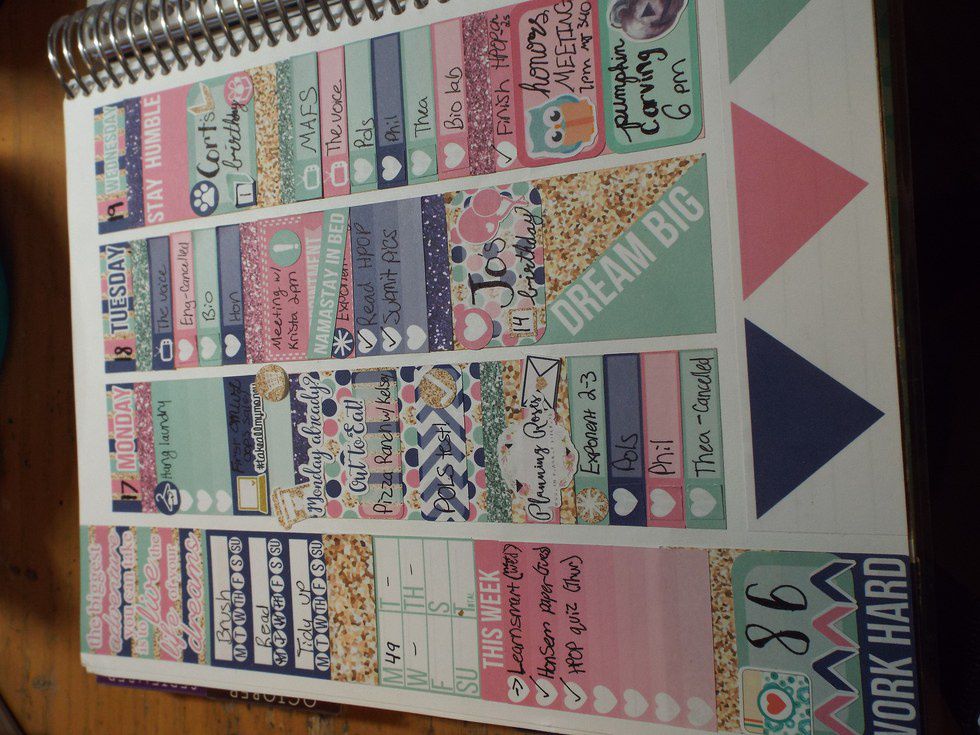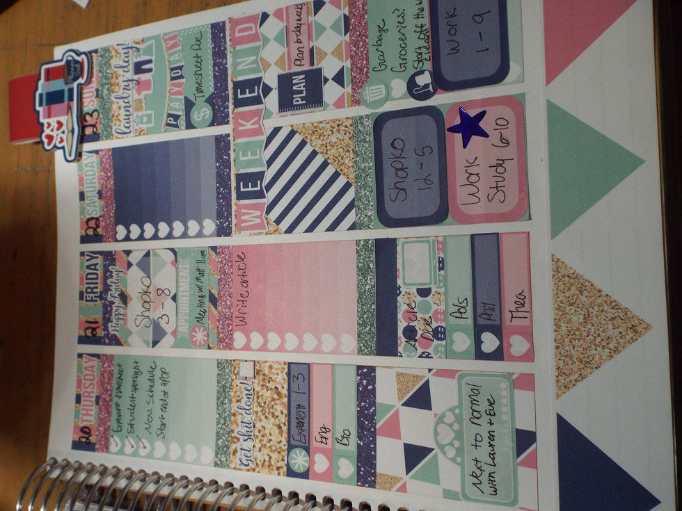 The Instagram icon on the sidebar is from SugarPeasPapeterie. The glitter laptop on Monday is from PreppyPlannerCo's sampler. The #takeallmymoney sticker is from TheStickerGenie's sampler. The PlanningRoses sticker I used is from, you guessed it, PlanningRoses. The owl with a book on Wednesday is from Korseh'sKreations, and the pumpkin is from BlackBeardPrints. The shiny blue star that I use to mark my work study on Saturday is from TheDollarTree. Lastly, the magnetic bookmark in the corner is from FabulouslyPlanned.