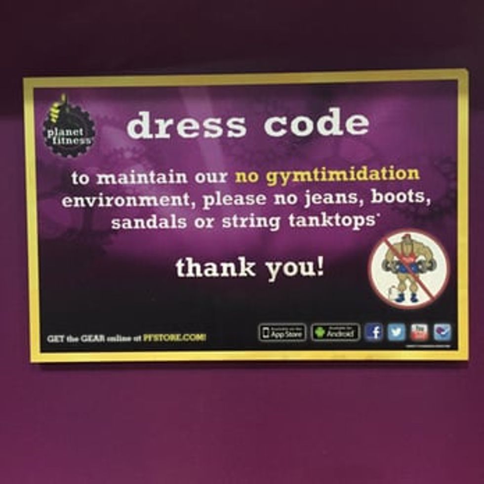 If you walk into the dressing rooms, you'll see a sign that forbids members from wearing string tank tops or sports bras with no shirt over them. Their reason is straightforward: to maintain a "no gymtimidation environment."