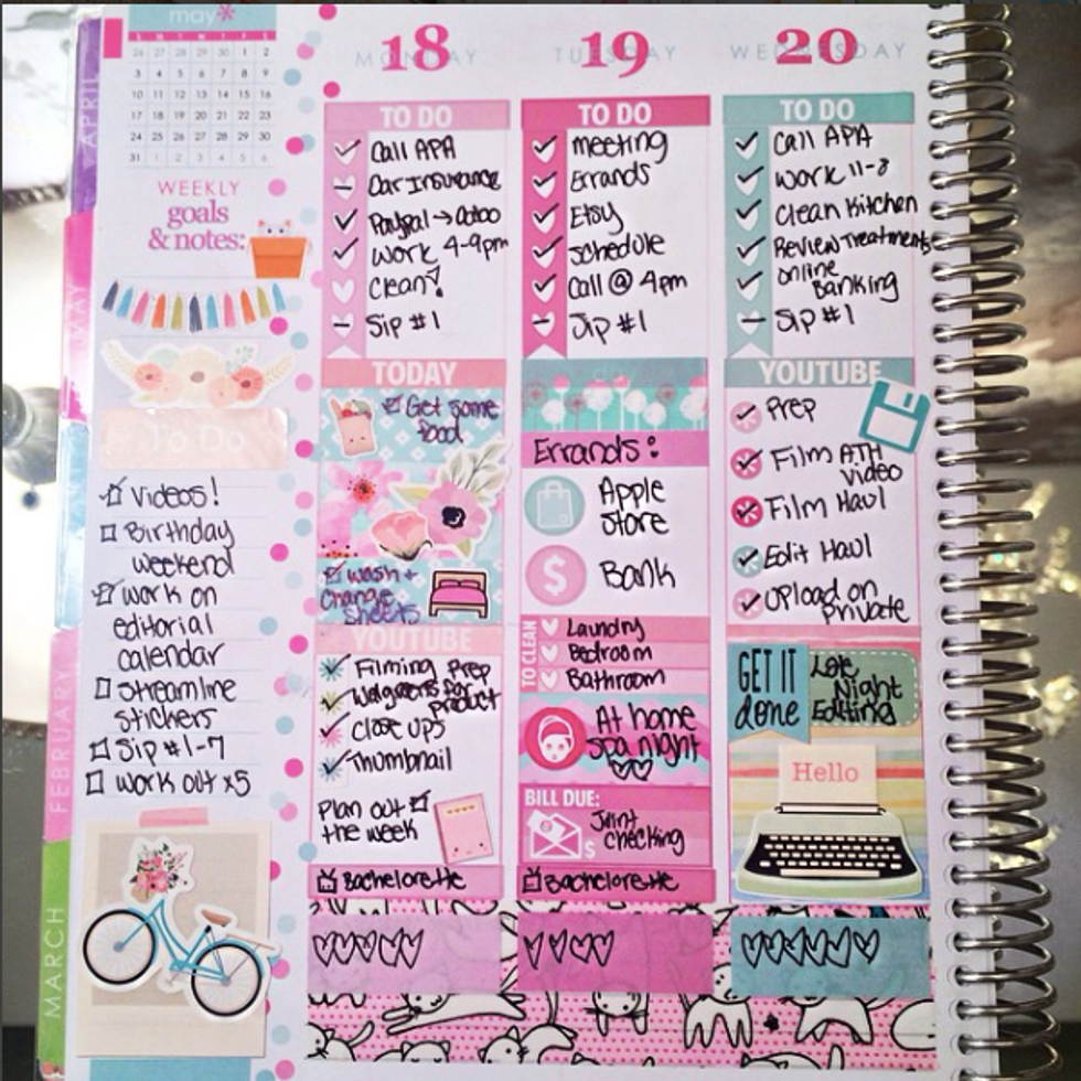 In the case of money and time, being a #planneraddict doesn’t come cost-free. Not only does decorating a spread take out a chunk of time each week (about an hour, but you can multi-task-- #netflixmarathon anyone?), the cost of supplies (~$4/sheet of stickers, ~$2 for decorative washi tape, pens, and other add-ons to the already $50 planner—adding up to an average of $8/week, or two Frappuccinos) match that of any other respectable crafting hobby-- think of it as a cross between scrapbooking and art journaling. However, if you’re really crafty, you can DIY your own stickers using label paper and a computer (but that takes more time than buying them, so you are paying with something either way).
