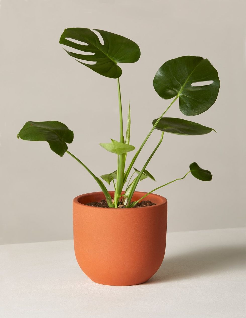 Ah, the Monstera, the plant you see in many drawings and illustrations. This plant is a great houseplant especially because of its intricate leaf shape. This plant needs bright indirect sunlight to thrive and requires watering about every one to two weeks. This plant is nicknamed the 'swiss cheese plant' because of their natural leaf holes. These holes are "theorized to maximize sun fleck capture on the forest floor by increasing the spread of the leaf while decreasing the mass of leaf cells to support."