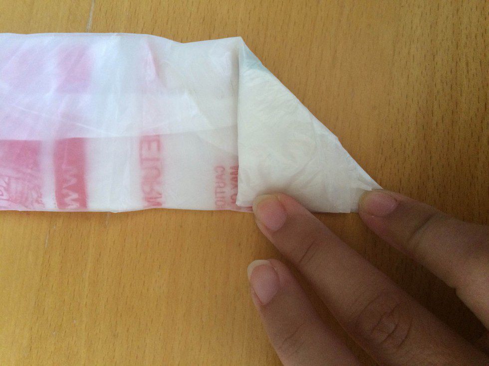 Start at the bottom of the bag with the square base; make sure the bag handles are at the top. Fold the corner- it doesn’t matter which corner- upwards so that it lines up against the edge of the bag in a triangle shape. You will then fold this triangle to the opposite side of the bag so that it lines up against the bag’s edge. Now, repeat this step until you get close to the handles of the plastic bag! Don’t be too worried if the triangle seems to not be lining up perfectly against the bag’s edge -- that’s OK! I have included a picture of this step below.