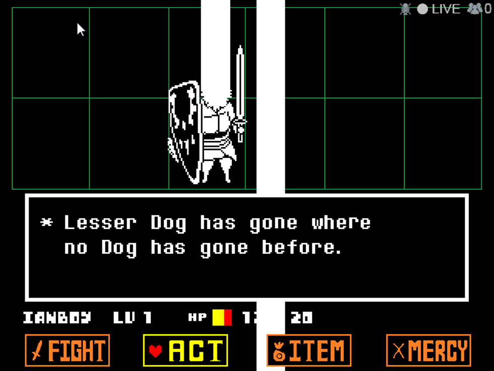 This game is hilarious. It has its fair share of jokes, most in the form of skeleton puns, but everything is just so silly. For example, there's a dog enemy called Lesser Dog. You can win the battle against him nonviolently by petting it. And petting it. And petting it some more. This causes its neck to expand. If you continue his, its neck will eventually expand off of the screen.