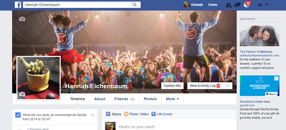 So we went ahead and sent friend requests to our friends who were in the know, posted some pictures of our Facebook-less friend, and then hoped against hope he would believe us. We even made her post Dance Marathon pictures to make her seem involved on campus (and not have to worry about a profile picture for a while). That's where it all got crazy. After sending friend requests to lots of friends, some other people began to notice.... and started sending her their own friend requests. Crazy, right? The things people will do if you have mutual friends.