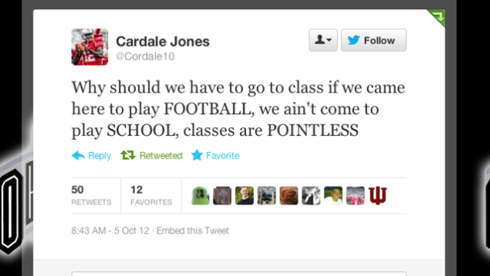 While Mr. Jones was almost universally derided for this tweet three years ago, fans were less hostile when he carried Ohio State to their eighth National Championship in 2014. Regardless, Mr. Jones actually makes a great point. Why should athletes have to "play school?" The sentiment of the All-American "student-athlete" is so ingrained in our society it is practically a cliche, as Mr. Bundy here heartily demonstrates: