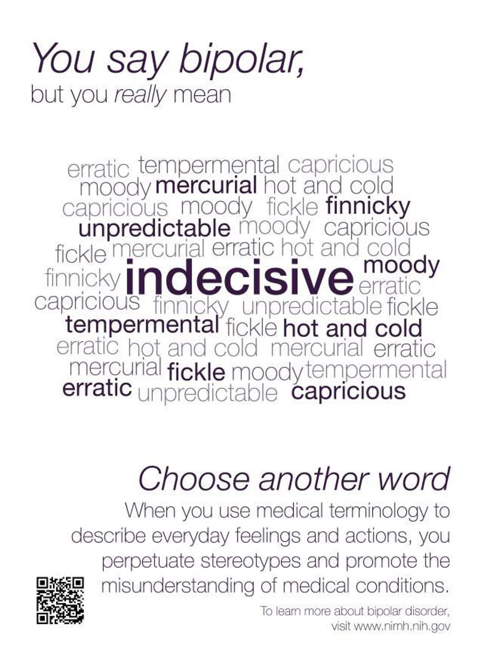 The same goes with anxiety and other psychological disorders. Being anxious or stressed is normal in certain situations, and doesn't mean you have an anxiety disorder. You are not bipolar if your mood changes quickly--people with bipolar disorder experience severe mood swings over a long period of time, not from minute to minute--and you do not magically have ADHD if you're not paying attention in class.