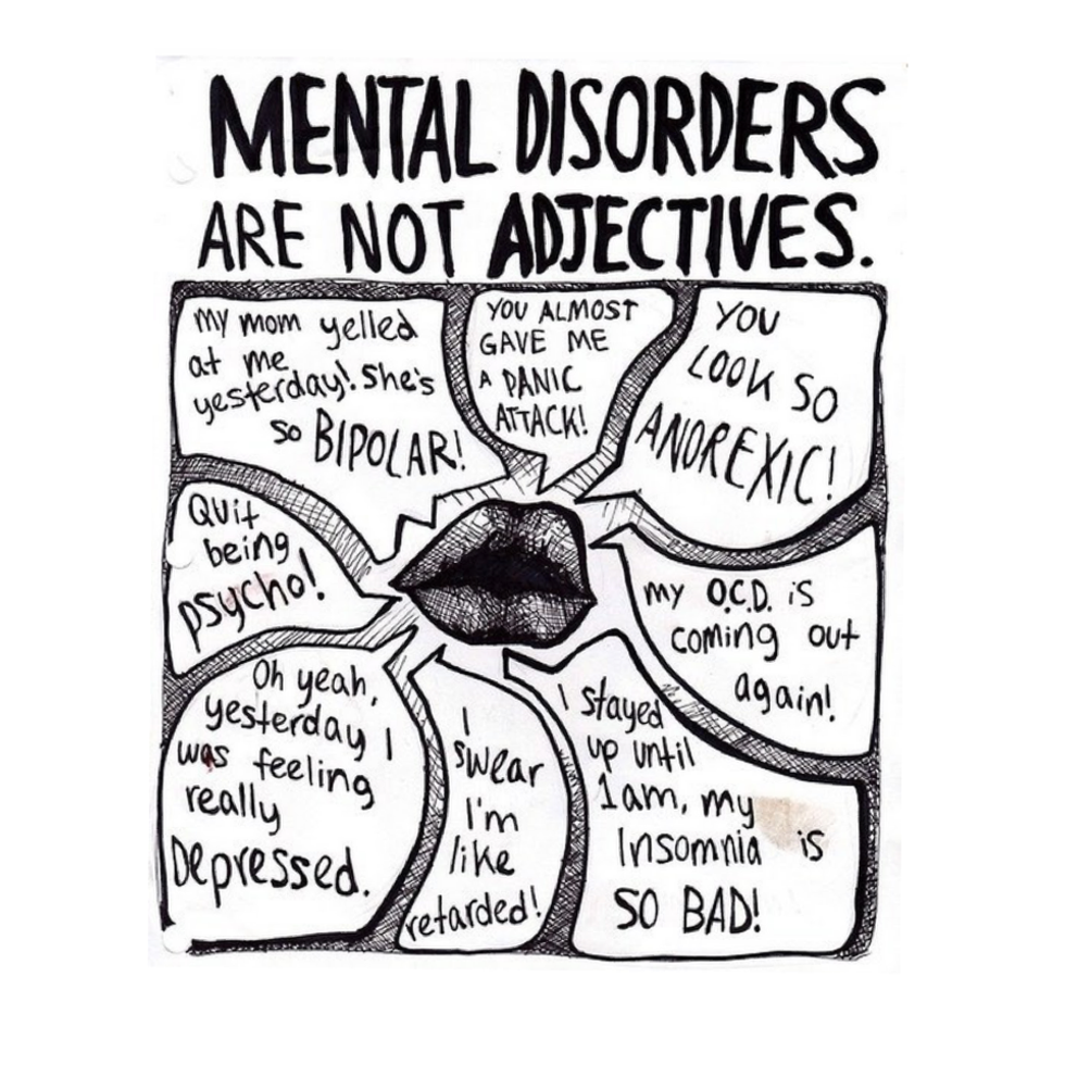 Using the names of real disorders to describe normal human behaviors is really discrediting to those who actually do suffer from the illness. Saying you must be "bipolar" because of a few hormonal mood swings implies that having bipolar disorder isn't a big deal, which is definitely not true. Please, don't ever joke or exaggerate that you're going to kill yourself. Suicide is not funny and every mention of it should be taken very seriously.
