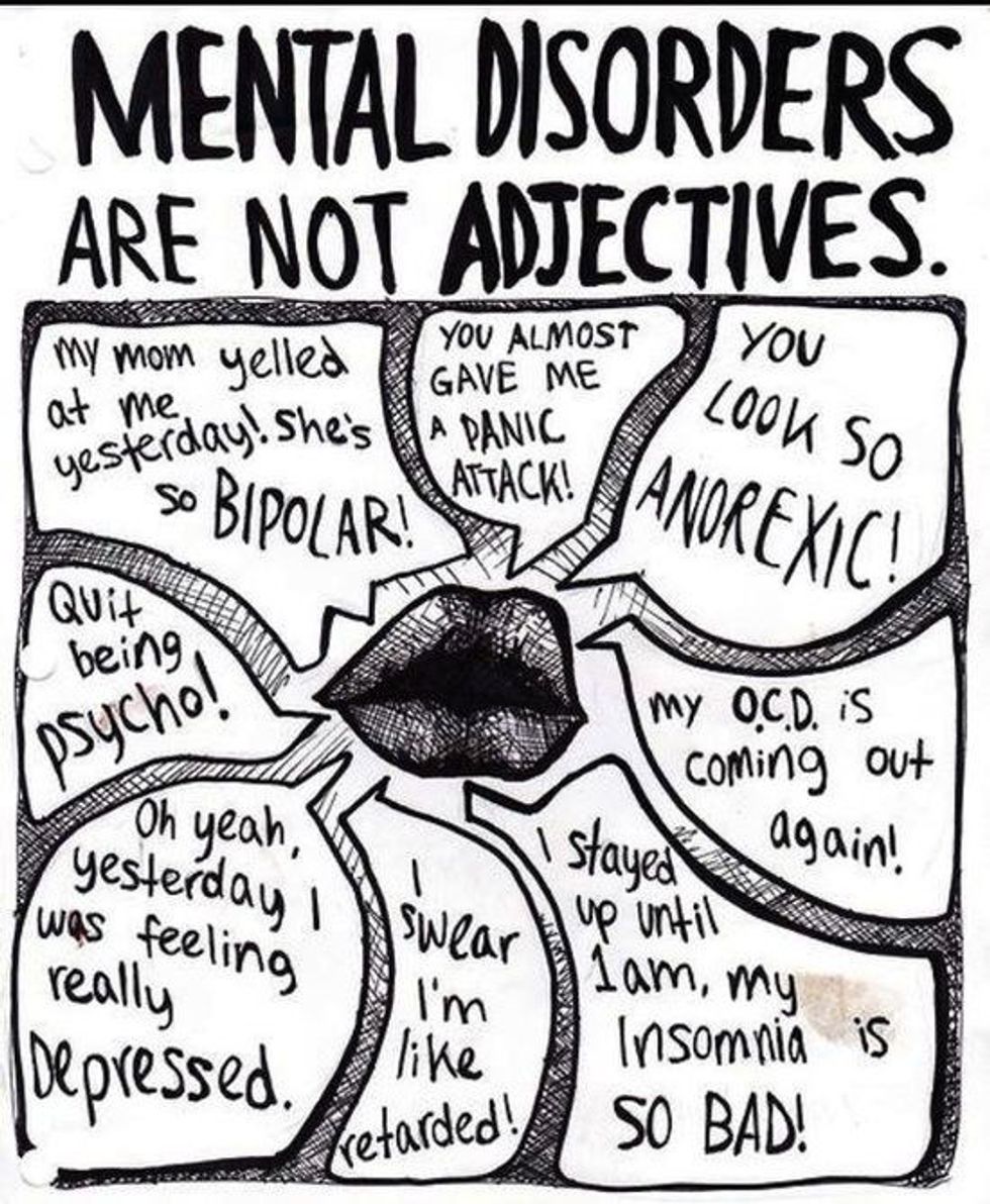 Why is it that people are so quick to judge, belittle, and doubt those who actually and truly suffer from a mental illness, while at the same time using said illness as a descriptor for themselves? When you don't actually have a mental illness, it may seem mysterious or quirky. Even the media often portrays characters with mental illnesses as eccentric, silly, and not to be taken seriously. And the illness is more-likely-than-not only present when the plot needs it to be. This so-called representation is not only inaccurate, but hurtful to those who suffer. Mental illness is serious, and it needs to be treated as such.