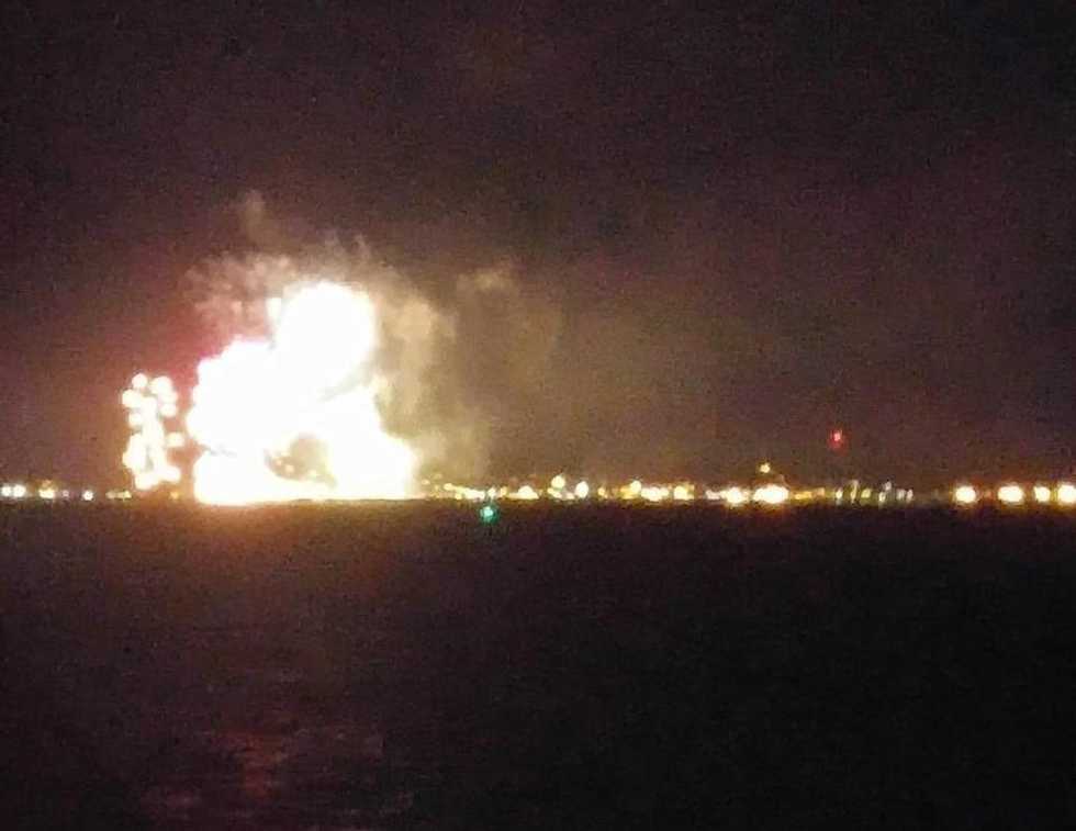 About 10 to 15 minutes into the fireworks display in Plymouth (which was at about 9:30 p.m. ET), the fireworks barge caught fire, which resulted in the show being cut short. According to sources, there were two barges in the harbor for the fireworks display, and a malfunction caused a fire on the first barge. The effect was all of the remaining shells exploding at once in all sorts of directions for about 10 minutes. About 35 minutes later, the second barge caught fire as well. The fires ultimately caused hundreds of fireworks to fall into the water.
