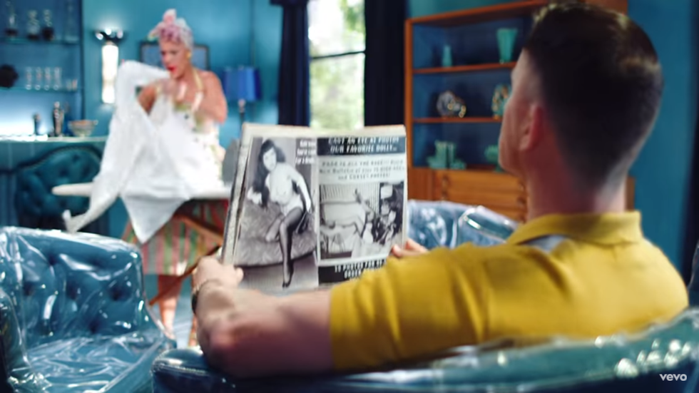 The next few scenes let us see a glimpse into their daily life routine. We see P!nk vacuuming the living room, while Channing is on the couch, reading the paper with his feet propped up. Looking at the clothes that they’re wearing, we are to assume that the video's inspiration comes from the 1950s. The wife is doing the housework while the husband relaxes and seemingly doesn’t do much help. If we look closely as well, we see that when P!nk is ironing Channing's clothes, we see him holding up the paper up higher, blocking his view of her. The best part? There seems to be a scandalous woman on the cover of the paper.