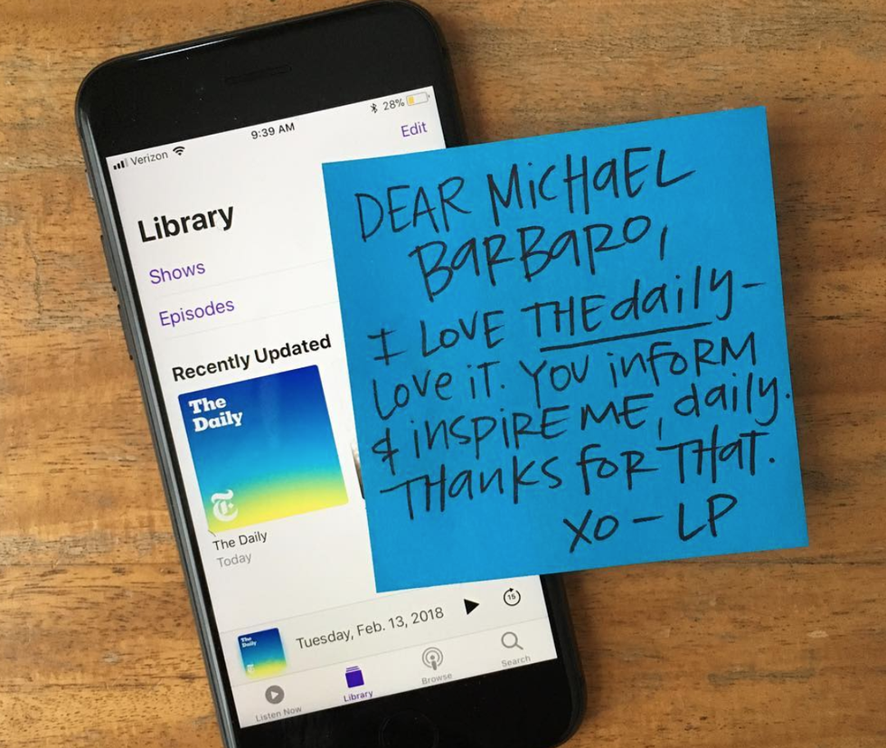 A sticky note praising "The Daily" host Michael Barbaro for keeping them informed.