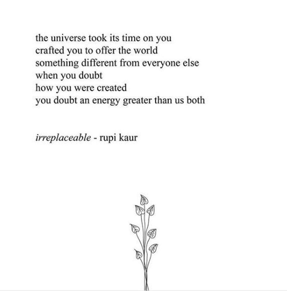 "The universe took its time on you / crafted you to offer the world / something different from everyone else / when you doubt / how you were created / you doubt an energy greater than us both." -Rupi Kaur