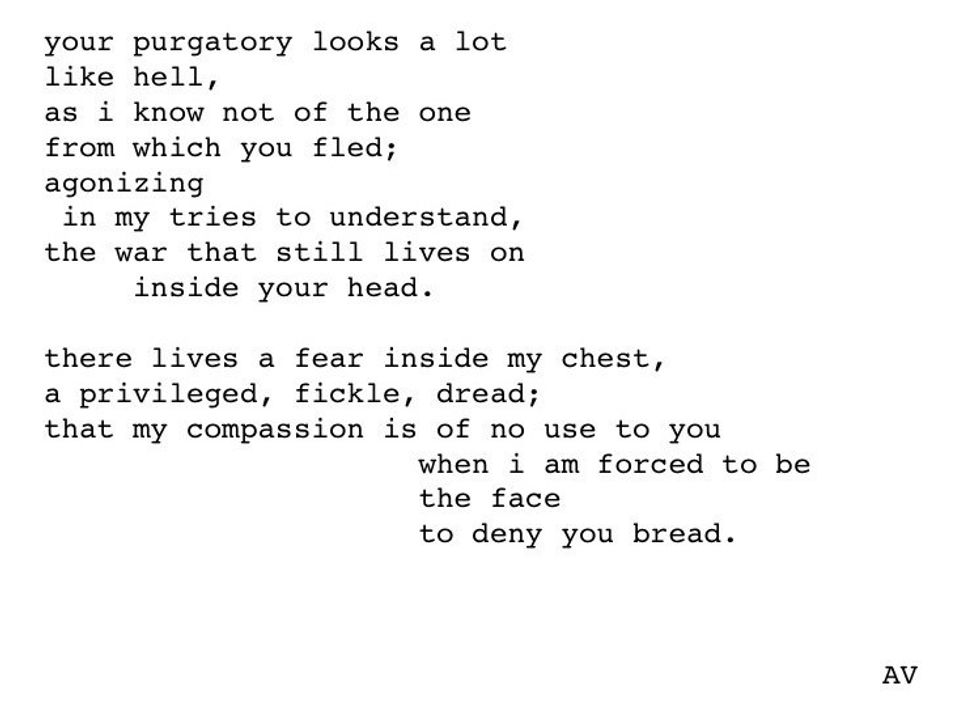 This holistic approach is correct, without a doubt, but can take a mental toll. I have had to rethink what it is to be compassionate, as I have taken it upon myself to make it my job. Yes, I am a poet, a sentimental sap by nature, but I have work to do. I cannot fall victim to lamentation. I realize now that because it is dutiful, I can no longer be soft-hearted in my compassion, and humanitarian work is wrought with paradox.