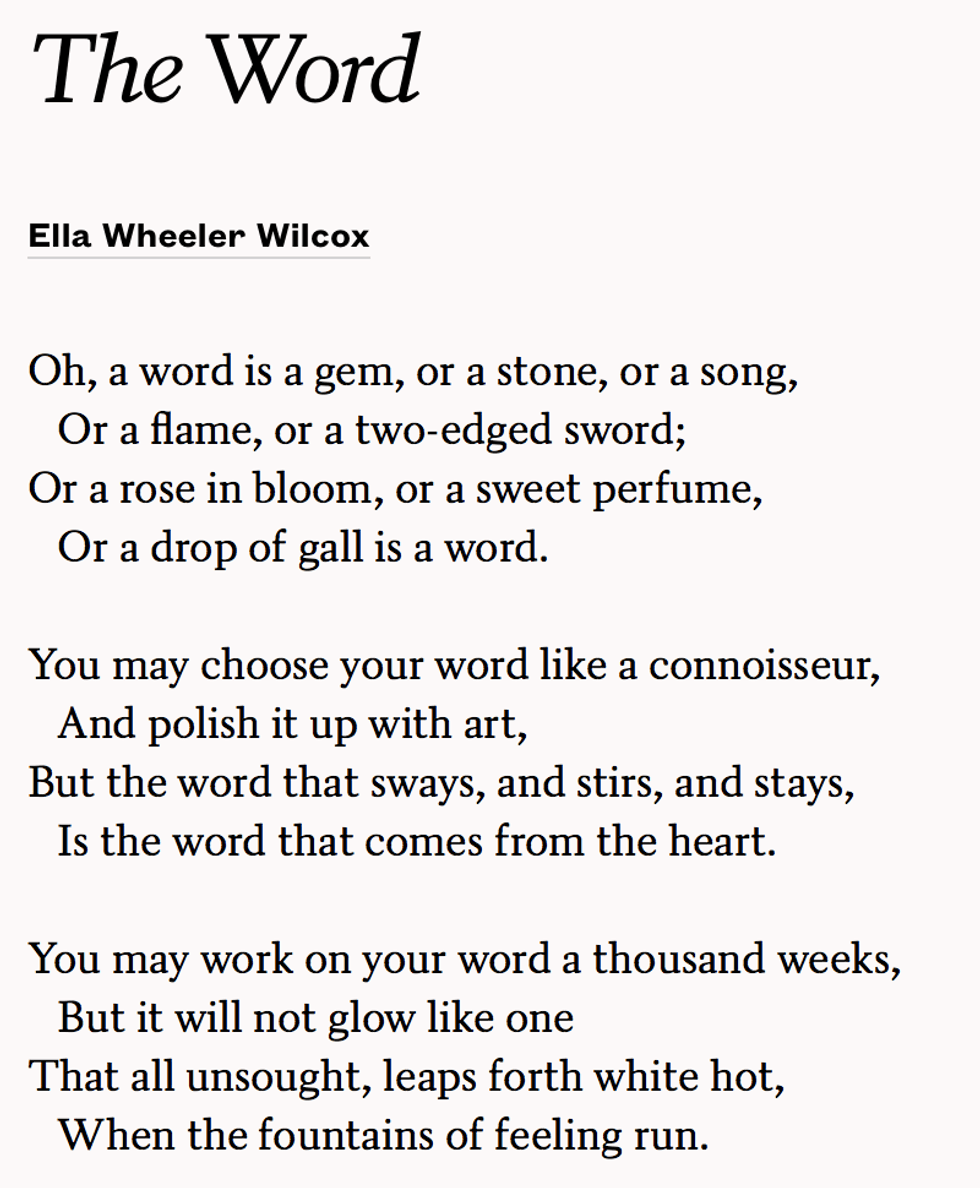 While most people enjoy poems at their surface, few (myself included) can easily enjoy the poem for what the poet is trying to say. I want to take a little time to delve into a short poem I found, called “The Word” by Ella Wheeler Wilcox, and dissect what its meaning is. Truthfully, I want to gush about how true her words are for a writer.
