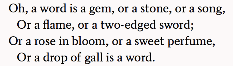 The first line, “Oh, a word is a gem, or a stone, or a song,” has our word transitioning from one object to a second and a third, insinuating that a word can be whatever you want, regardless of what it actually is. The first word, “Oh,” starts us with something like a breath the poet would speak to begin the reading, such as if the word is a song and we are singing it to the audience.