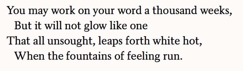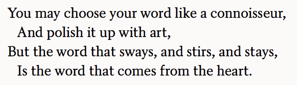 The final stanza continues what the second stanza started; no matter how much work you put into a word, the most beautiful words are the ones that “leap forth white hot, / When the fountains of feeling run.” The tone here gets more urgent, like Wilcox was letting the words spill onto her page as soon as they were thought, but it’s still restrained and thought out.