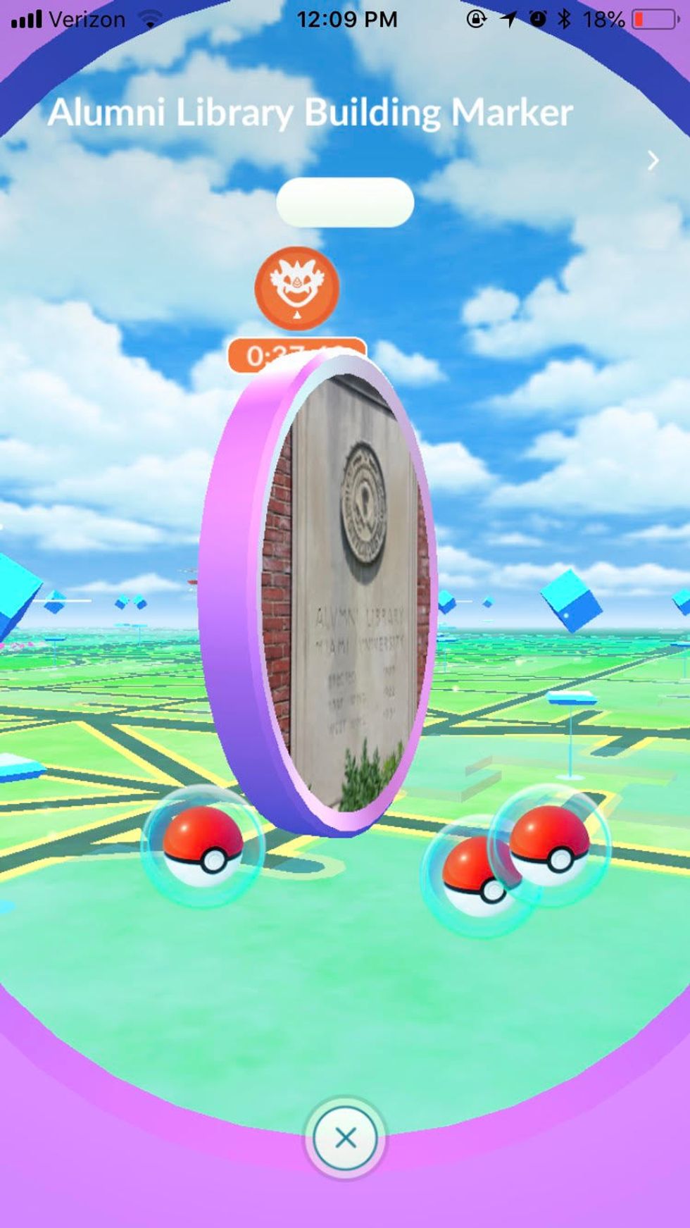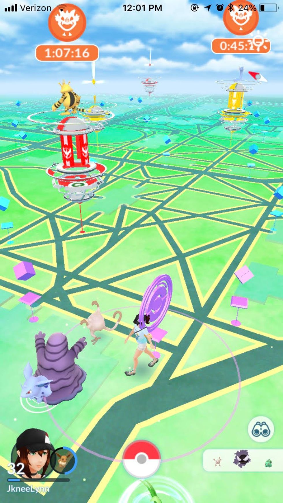 In this picture, you see can see some wild Pokémon next to my character. The number in the bottom left hand corner is the trainer level I am at. The blue bar below is how much stardust I have. To level up, you must get X amount of stardust. You receive stardust by spinning Pokéstops and fighting gyms. You can also see what looks like buildings of different colors and times above them. The colors are reflective of what team is currently holding that gym. The teams are red for valor, blue for mystic and yellow for instinct. The times above the gyms are showing how much time is left for the raid battle happening at the gym. The blue cubes next to the buildings are Pokéstops.