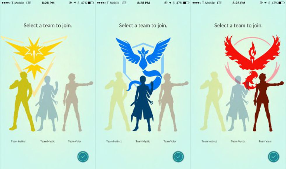 Another aspect of the AR game is that once a player has reached level 5, they get to pick a team to be on. Currently, there are a total of three teams, Mystic/Blue, Instinct/Yellow, and Valor/Red. Each team is represented by Legendary Pokemon; Articuno, Moltres, and Zapdos