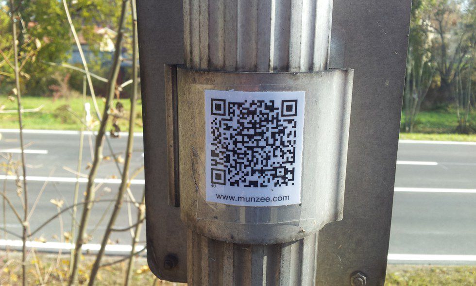 Meet Munzee. It's a QR code-based, scavenger hunt-type game that requires you to go different real-world places to find small QR-code stickers, or "munzees," which can be stuck on light poles, the back of signs, fences, electrical boxes, or other different fixtures. You then scan, or "capture," the munzee to get points, which can range between 5 and 100 points depending on the type of munzee. That's the goal of the game—to rack up points, level up, and capture as many munzees as you can. It's simple, and terribly addictive.