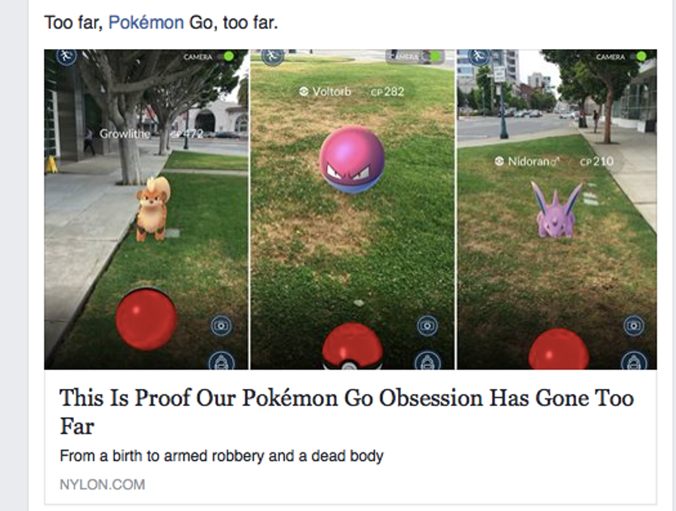 I remember growing up during the time that Pokemon was the most popular, and witnessing the kids on the playground during recess swap and share their trading cards with each other. {Pokemon was first created in 1995, and the franchise later expanded throughout the late '90s and the early-mid 2000's} My seven year old self even pretended to like Pokemon, or forced myself to because I was an awkward first grader, and I wanted the other kids to like me because it was something that was very much popular among my peers. But even though I tried to like it, I just couldn't get into it and did not understand the hype of it all. Now, it seems as though Pokemon has come back stronger than ever, and it's like I'm in grade school again, trying to understand why it's so likable. Now I am constantly hearing about it everywhere that I go, and not even that - I'm seeing it in action. Even in my small, conservative town of Watertown, where it feels mainly populated by the older generation, teenagers and young adults are wandering around town with their phones out, in groups playing the well-liked game and coming together in new ways than ever before. These were just some things I screenshot from my newsfeed. Trust me, there was way more: