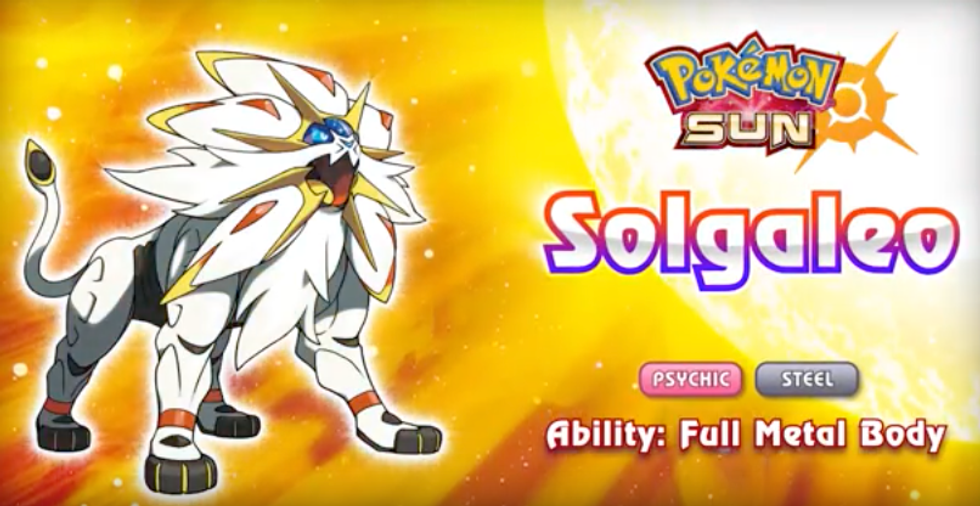 Solgaleo, the Sunne Pokémon and mascot for "Pokémon Sun," has the typing of psychic and steel and the ability Full Metal Body, which prevents its stats from being lowered. This lion-esque creature has the signature move Sunsteel Strike, which disregards the opposing Pokémon’s ability and appears to be a physical attack move. According to the details listed on the official Pokemon website, Solgaleo has been considered an emissary of the sun since ancient times and stores energy from the sun throughout its body.