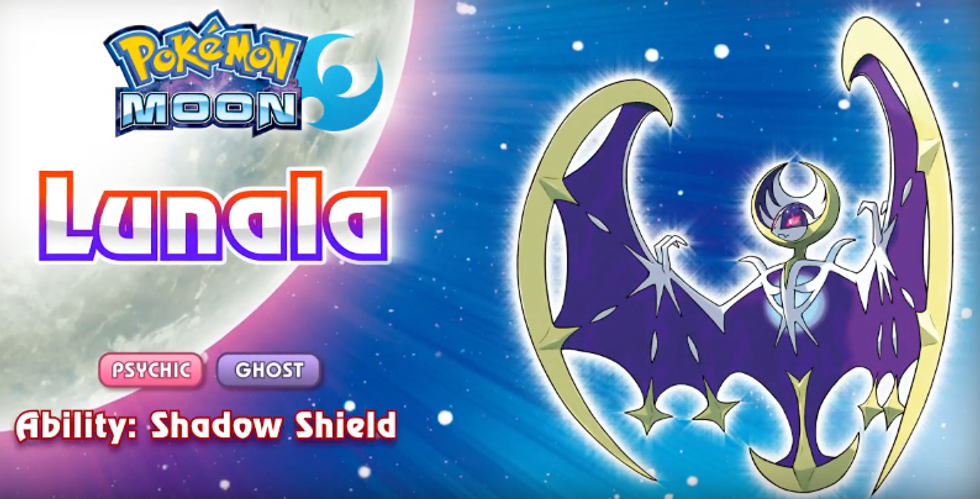 Lunala, the Moone Pokémon and mascot for "Pokémon Moon," is confirmed to have the typing of psychic and ghost with the ability Shadow Shield, which reduces the amount of damage received from an attack when the user has full health, or Hit Points (HP). Moongeist Beam is Lunala’s signature move and also disregards the opposing Pokémon’s ability. From the video footage, the move appears to be a special attack move. Official details discuss how its wings absorb energy from light and how it resembles the night sky.